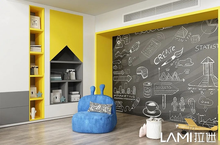 拉迷還習慣在兒童房保留了一處趣味角落,嵌入式到頂柜收納有趣的畫冊,滿墻黑板報,增加父母和孩子的互動性。