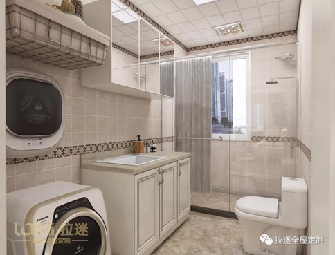 衛生間同樣采用大理石臺面,并在頂柜用鏡子作為面板,并設計了隱藏式把手,大大加強了洗漱臺的實用性和美觀度。