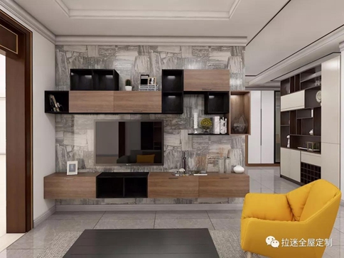 ▲選擇一個高架柜配一個矮柜,可以形成不對稱的視覺效果。一個矮柜配幾組高柜吊柜組成一面背景墻,可以豐富空間的設計元素,打造出多層次的視聽效果。