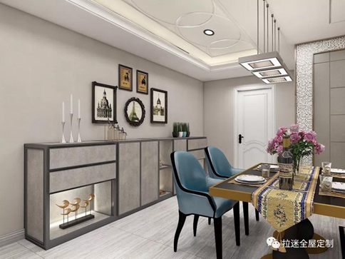 餐邊柜在設(shè)計(jì)時(shí)將酒柜結(jié)合其中,既滿足了餐邊柜的儲(chǔ)物功能,也滿足了酒柜的展示功能。而穿插酒柜的設(shè)計(jì)更是將主人毫無(wú)張揚(yáng)之態(tài),又不失自信之姿的品質(zhì)表達(dá)的淋漓盡致。