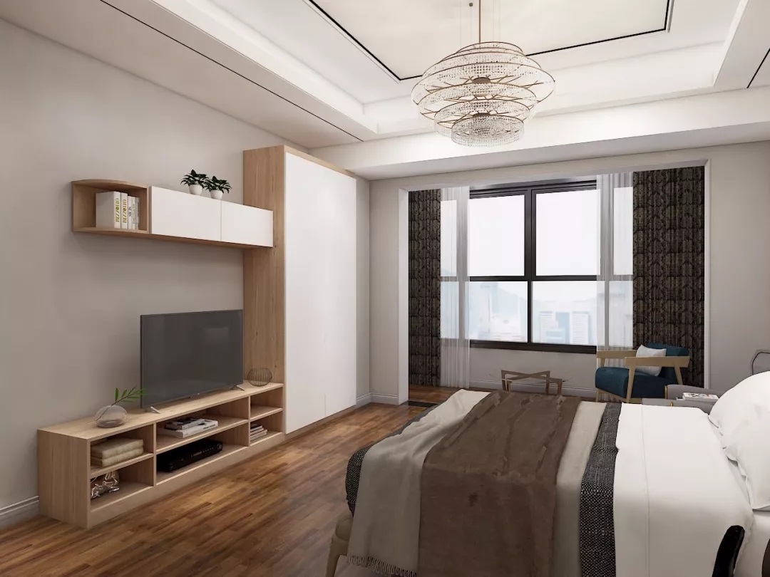 如果空間夠大,那就整體來一個包裹:將電視柜鑲嵌在衣柜中間。正對著臥床,這樣再不用擔心在炎炎夏天被曬黑了。躺在床上就能度過一個周末。