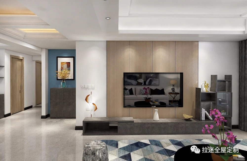 針對縱深較大的客廳,長版電視柜可以起到延伸空間的作用,讓客廳從視覺上變得更為開闊。如果背景墻過于寬闊,可以考慮在兩邊加裝高柜,不但儲物空間激增,派頭也顯得更大一些。