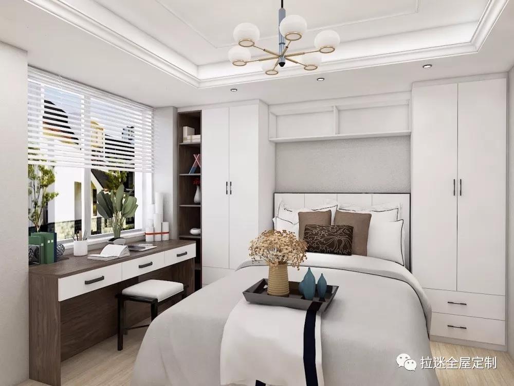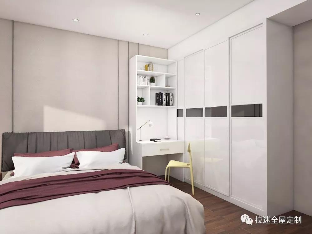 如果臥室稍微大點,可以擺下獨立的衣柜,而且是擺在床尾位置,正好又需要電視柜或書桌等功能的,
