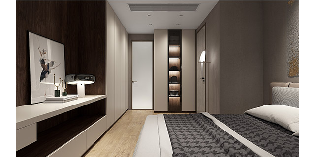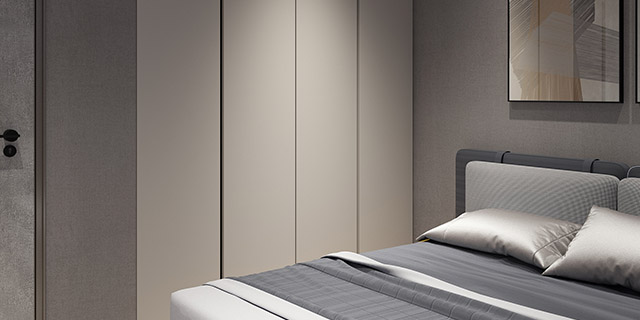 次臥主要柜體是一個沙漠灰的頂天立地衣柜,