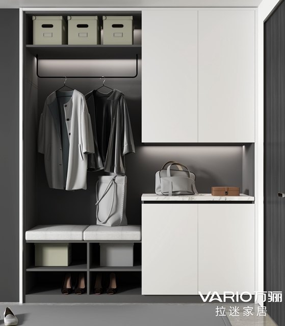 玄關柜上下分層設計,再加上掛衣區與換鞋凳,面積不大卻功能齊全
