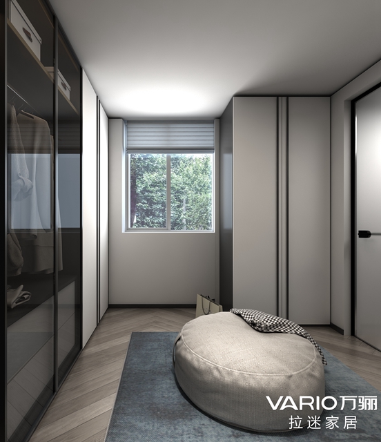 衣帽間采用實木面板和玻璃面板組合,虛實結合,空間更顯通透,魚骨拼接地板 層次分明