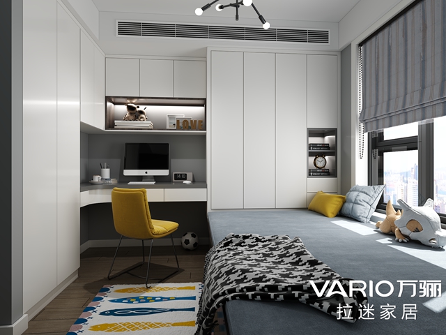 兒童房則比較活潑明亮,榻榻米是家居收納的小能手,而書桌的弧形轉角能有效防止孩子磕碰,很貼心哦!